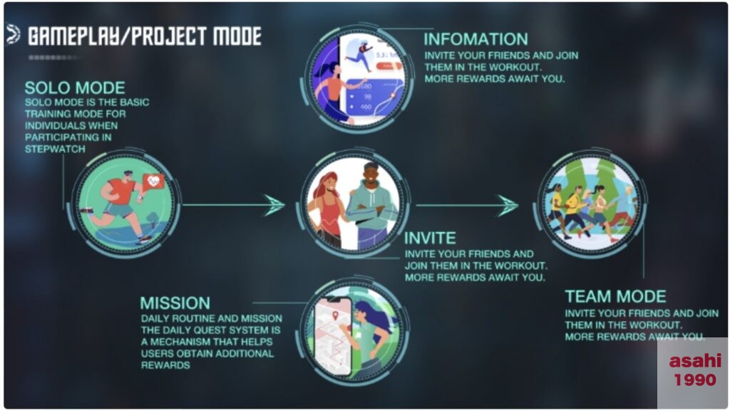 ウォーキング、ランニング、フィジカルトレーニングを行うことで、仮想通貨やNFTを獲得でき、獲得したアイテムは、プラットフォーム内の活動に使用したり、プラットフォーム上で取引することができます。